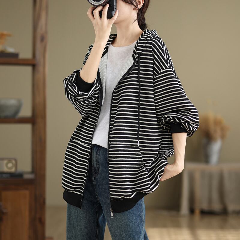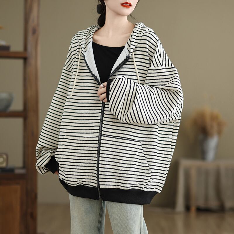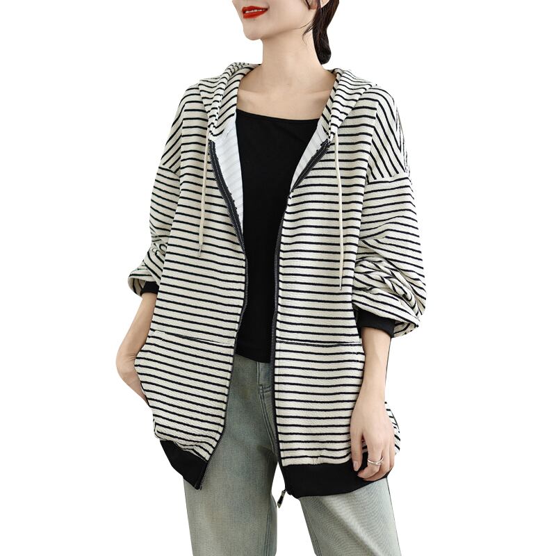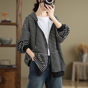 初回送料無料 秋冬レディースファッション ストライプ 帽子付き カーディガンパーカー 人気上着