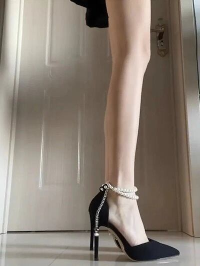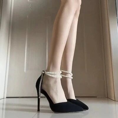 メガ割 メディヒール 細いかかと ブラック パールベルト ハイヒール セクシー 浅口 スエードの単靴