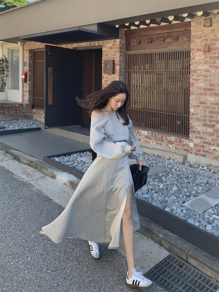 こなれコーデが完成 2024秋冬 スカート パーカー オフショルダー ロングスカート セットアップ あったか