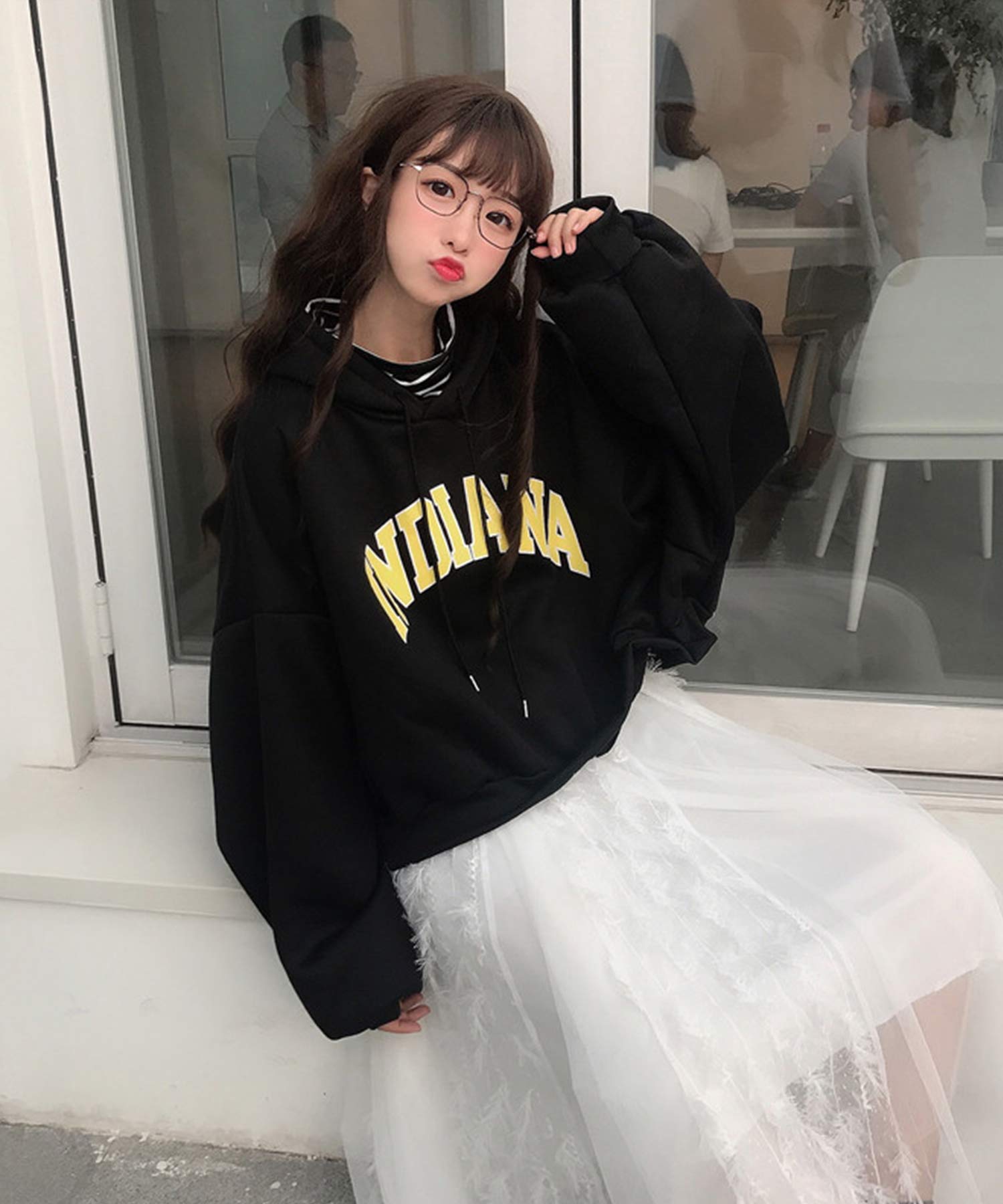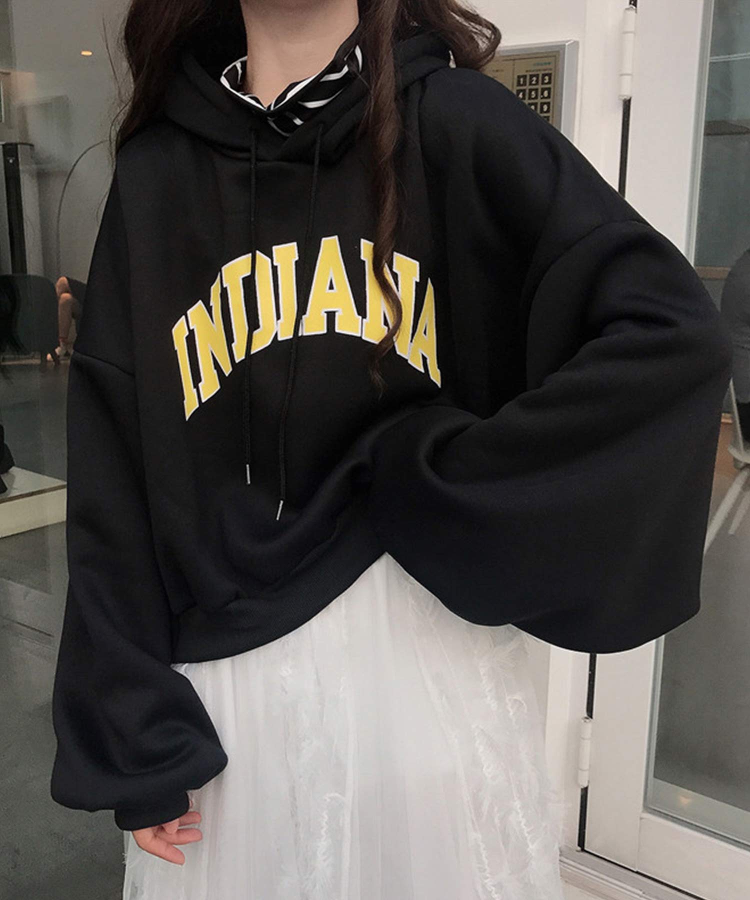 クロップド丈 重ね着風 ビックパーカー 【即納】 裏起毛 ロゴ レディース 韓国 プチプラ おしゃれ
