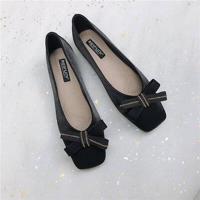 スクエアトゥ フラット パンプス ローヒール 1cmヒール レディース ブラック ブルー アプリコット 3色展開 リボン 歩きやすい 履きやすい 走れる 疲れにくい 休日 お