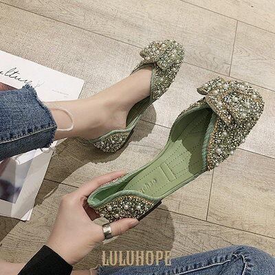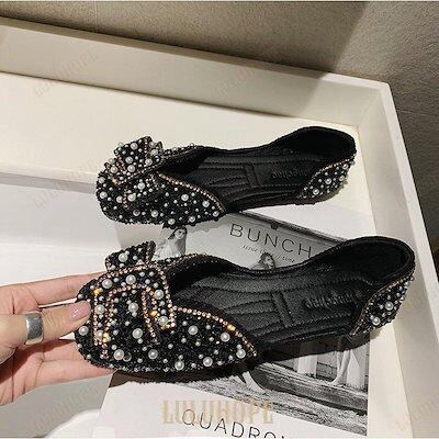 【本日のアップデート】ローファー レディース パンプス フラットシューズ 靴 ビジュー パール付き リボン 柔らかい キラキラ 結婚式 二次会 パーティー キレイめ