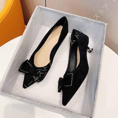 パンプス ポインテッドトゥ 4cmハイヒール ピンヒール レディース 美脚 スエード 軽量 ローヒール オールシーズン ヒールパンプス リボン ハイヒールシューズ