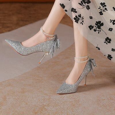 パンプス 痛くない クリスタルスパンコール成人式真珠チェーンリボン女性ハイヒール結婚靴 靴レディースパンプス ローヒール ポインテッドトゥ