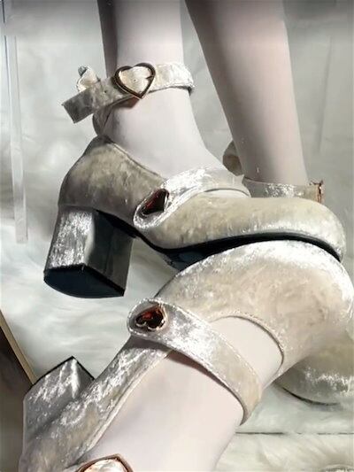 ヒールパンプス ベルベットホワイトマリージェン婦人靴甘め風ハイヒールリボンlo靴にスカート太ヒール