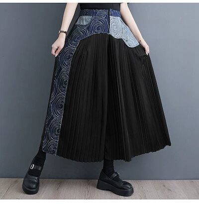 ワイドパンツ パンツ デニムパンツ レディース 黒 春夏 きれいめ ガウチョパンツ スカーチョ 異素材切替え大きいサイズ テーパードパンツ ウエストゴム ロング ボトムス ロールアップ ノアール サル