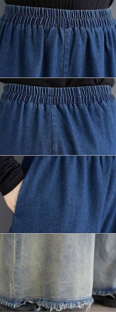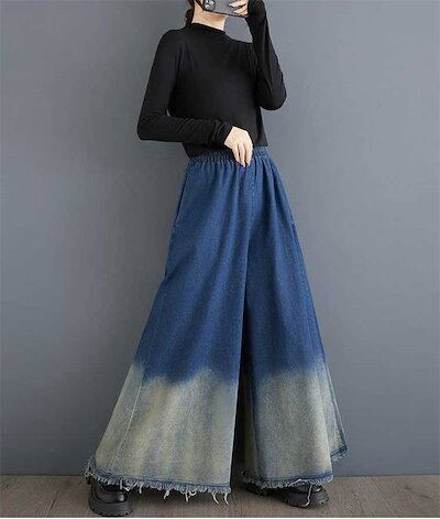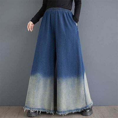 パンツ デニムパンツ レディース 新作 グラデーション ロング ワイドパンツ 綿 コットン ガウチョパンツ ロングパンツ ボトムス フリンジ ゆったり デザイン感 体型カバー 大人 カジュアル エレガ