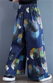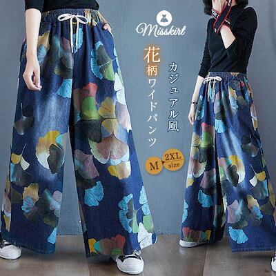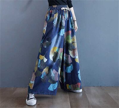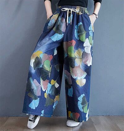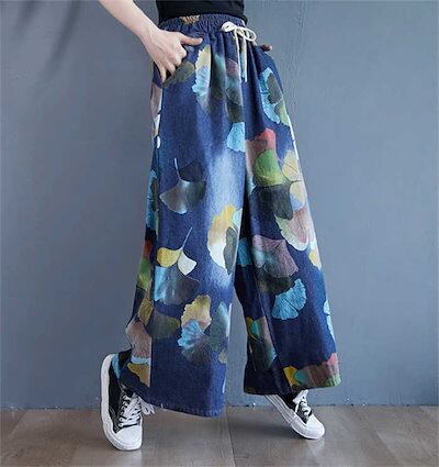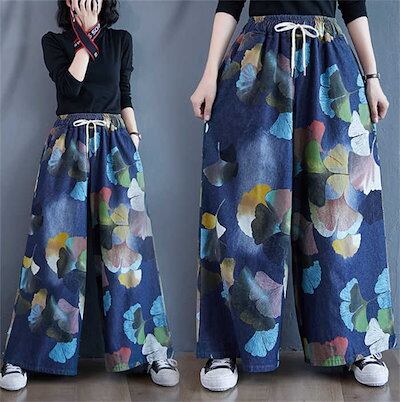 ワイドパンツ デニム ガウチョパンツ レディース ロング パンツ ボトムス 花柄 プリント 銀杏の葉 体型カバー ロングパンツ シンプル 大きいサイズ 春 秋 冬 ハイウエスト 着痩せ 美脚 レトロ