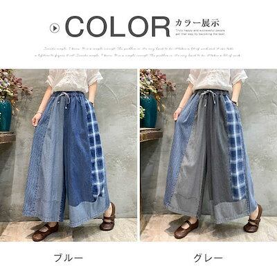 ワイドパンツ デニム レディース ガウチョパンツ ロング パンツ ボトムス 9分切り替え チェック ストライプ 体型カバー ウエストリボン リボン ゴム 大人 大きいサイズ 春 秋 着痩せ 美脚 レト