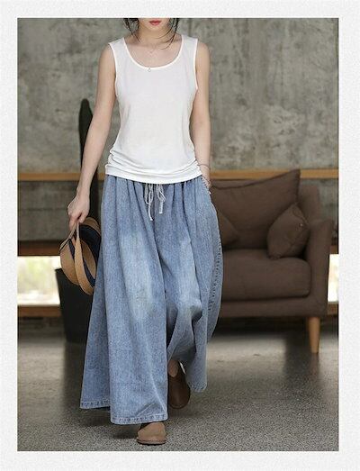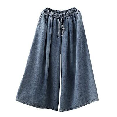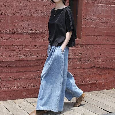 即納 デニムパンツ ワイドパンツ レディース ガウチョパンツ ロング丈 パンツ 体型カバー 無地 大きいサイズ ボトムス ラシャ 着痩せ 美脚 おしゃれ カジュアル ロングパンツ ウエストゴム 春 夏
