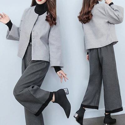 セットアップ ワイドパンツ 卒業式 レディース 3点セット ウール混 スーツ ノーカラー アウター ガウチョパンツ ハイネックニット パンツスーツ 入学式 卒業式 入園式 おしゃれ 結婚式 コーデ 体
