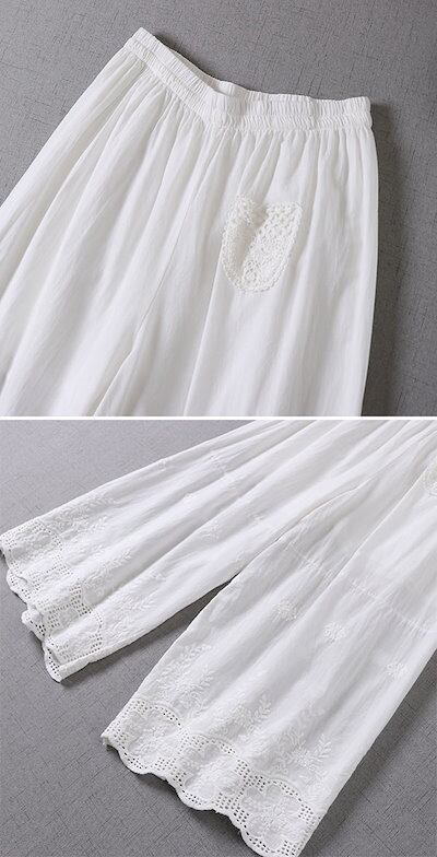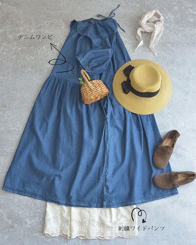 刺繍ワイドパンツ ペチコート ペチパンツ レディース ボトムス シンプル 刺繍 花柄 レース カットワーク 体型カバー 重ね着 綿100% ナチュラル カジュアル ゆったり 裾レース フリル ガウチョ