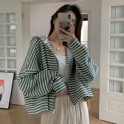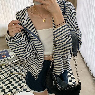 春 アウター カジュアル百掛け パーカー レディース 韓国ファッション ストライプ 長袖トップス 怠惰な風 薄 ショートアウター 着痩せ UVカット