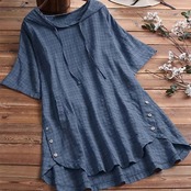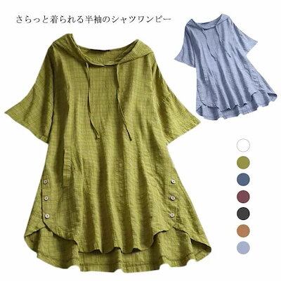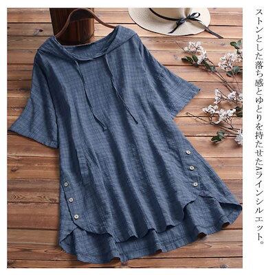 チュニック フード付き ロングシャツ チェック柄 シャツ ブラウス 綿麻風 フード付き 半袖 レディース トップス ゆったり 涼しい 春