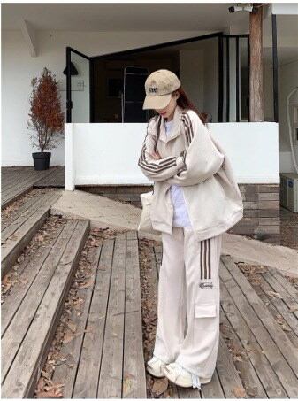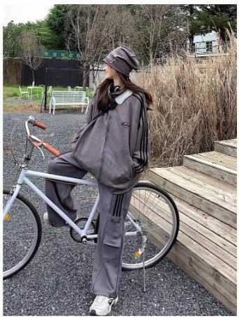 2024 春秋 2点セット トップス お出かけ 羽織り ショート丈 セットアップフルパーカーラウンドヘムルーズ サイド上下ボトムス ストレート系冬 ゆったりサイズワイドシルエットリラックストラック