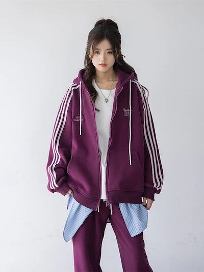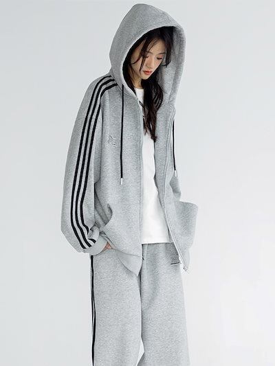 2024 秋冬 2点セット トップスパーカー フード付き チャック韓国羽織り ショート丈 フルパーカー ルーズ サイド上下ボトムス ストレート系冬 ゆったりサイズワイドシルエットリラックストラック