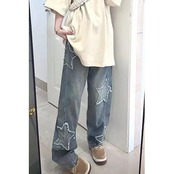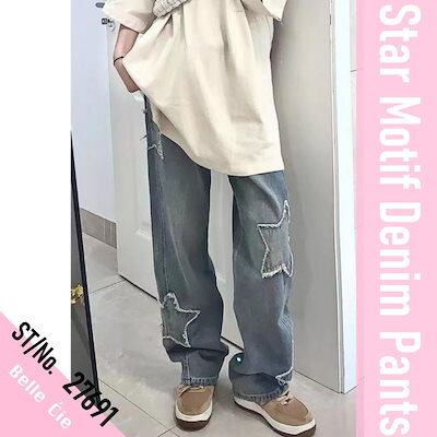 デニムパンツ 星 ワッペン バギーパンツ ワイドパンツ レディース デニム かわいい 貼り付け デザイン カジュアル ロングパンツ 大きいサイズ かっこいい