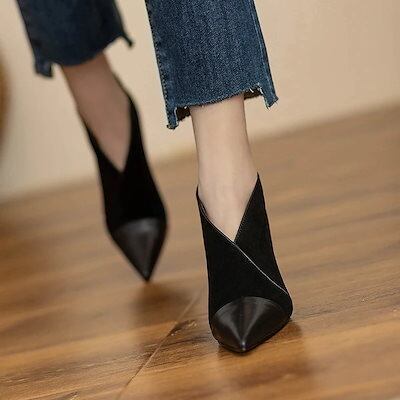 ヒールパンプス フランス風ヒ一ルパンプスポインテッドトゥ切り替えショートブーツ ピンヒール 今の流行
