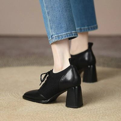 欧米お洒落レースアップシューズ復古ハイヒール通勤ニット切り替え太ヒール ローファー YX1福袋