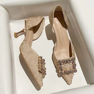 スタイルアップヒールパンプス24のレディスタイルシューズ柔らかい表面スティレットヒールクリスタルダイヤモンドスクエアバックルコントラストカラーハイヒール