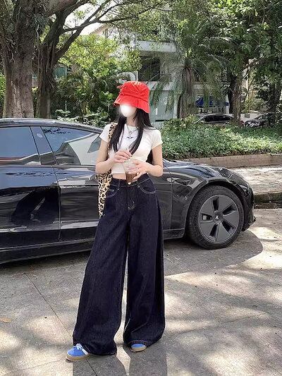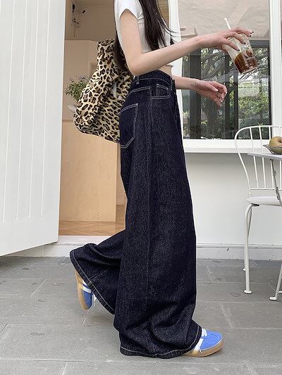 2025 初秋 デニムパンツ パンツ ロング丈 デニム ジーンズ ワイド ストレート ハイウエスト 美脚効果 脚長効果 細見え レトロ インディゴブルー レディース かわいい お 韓国ファッション