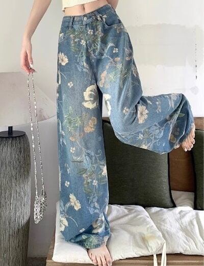 2024 春夏パンツ デニム ジーンズ ロング丈 ワイド ストレート 花柄 ハイウエスト 美脚効果 脚長効果 細見え 夏 おしゃれ かわいい ガーリー キュート 韓国ファッション レディース お出かけ