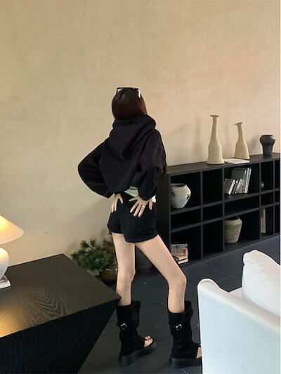 2024 秋冬トップス フード付き スウェット 長袖 丈短め 秋 黒 ブラック おしゃれ かわいい 韓国ファッション レディース お出かけ