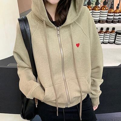 2024 秋冬アウター パーカー フード付き ジップ チャック 長袖 花柄 ポケット ハート 細見え 秋 緑 カーキ おしゃれ かわいい ガーリー キュート 甘め 韓国ファッション レディース お出か