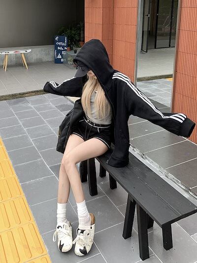 2024 秋冬トップス パーカー フード付き チャック 長袖 ストライプ ゆったり 細見え 白 黒 おしゃれ かわいい ガーリー キュート 甘め 韓国ファッション レディース お出かけフルトラック