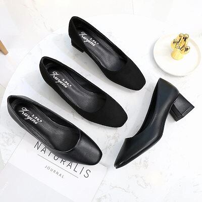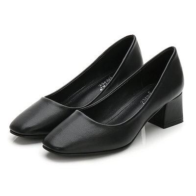 メガ割 黒の作業靴ソフトレザー太ヒール浅口スチュワーデスシューズフォーマルホテルシューズワークシューズワンピース