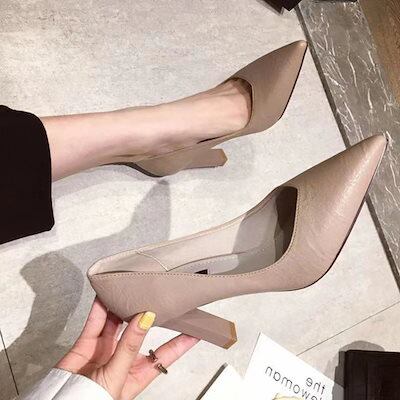 スタイルアップヒールパンプス 黒のハイヒールのプロの太いヒール尖った靴