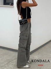コダック-女性のシックなデニムストリートウェア、フレアパンツ、カーゴパンツ、ルーズポケット、スポーツジップ、クールガール、y2kファッション、秋、2023 y2k ボトムス T240831223151_01