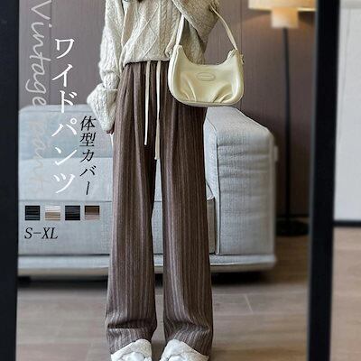 ワイドパンツ 冬 パンツ レディース ガウチョパンツ 秋冬 パンツ ワイド ストレートパンツ ハイウエスト カジュアル ボーダー あったか ガウチョ ボトムス ウエストゴム ポケット付き 大きいサイズ