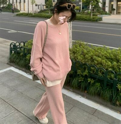 セットアップ レディース ニットセット 上下セット 快適 リブ 長袖 ワイドパンツ 無地 セットアップ レディース コーデ カジュアル レイヤード ニットセーター ガウチョパンツ 韓国風 おしゃれ 着