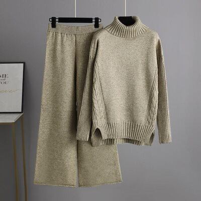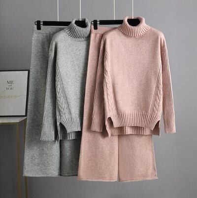 ニット セットアップ ワイドパンツ レディース 秋冬 長袖 タートルネック ハイネック スリット 春 おしゃれ セーター ニットパンツ パンツ タートルネック パンツスーツ ママ ガウチョパンツ プル