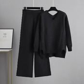 ニット セットアップ ワイドパンツ レディース 秋冬 長袖 Vネック ケーブル編み スリット 春 おしゃれ セーター ニットパンツ パンツ ニットセーター パンツスーツ ママ ガウチョパンツ プルオー