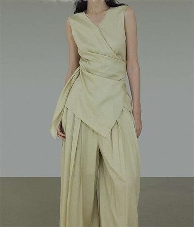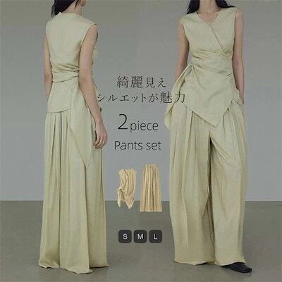 セットアップ リネン レディース パンツスーツ 上下セット 春夏 ベスト ジレ ノースリーブ ガチョウパンツ スカーチョ スカンツ パンツ ワイド ハイウエスト ポケット付き ロング パンツドレス ゆ