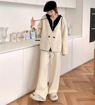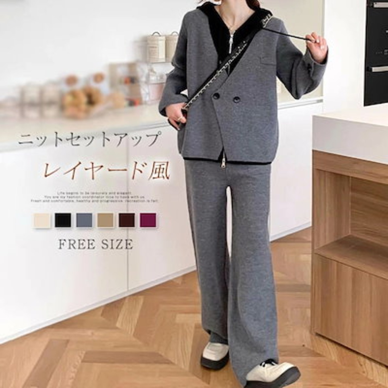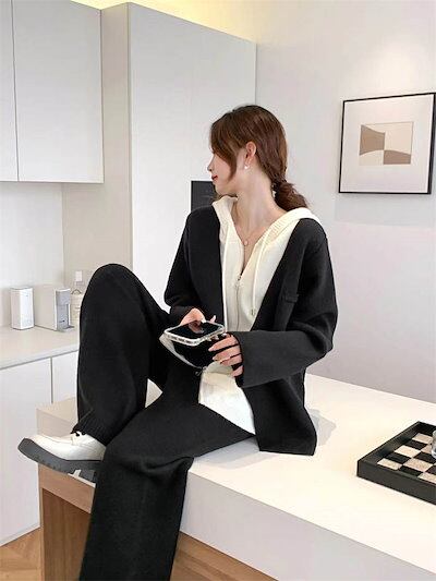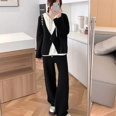 ニットセットアップ レディース パンツスーツ レイヤード風 2点セット フェイクレイヤード 春 秋冬 ニット 2点セット パンツ コート ロング丈パンツ パーカー 長袖 秋 冬 ワイドパンツ ゆったり