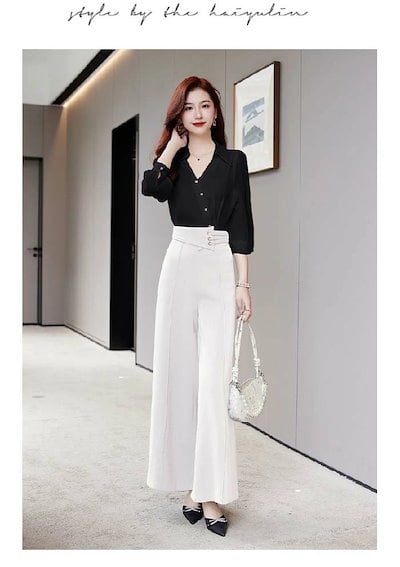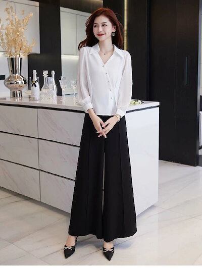 2点セット セットアップ レディース パンツスーツ ワイドパンツ シャツ ブラウス ロングパンツ タックパンツ 長袖 シャツ 春 夏 秋 さらりと心地よい 着痩せ シンプル カジュアル 女性らしい