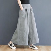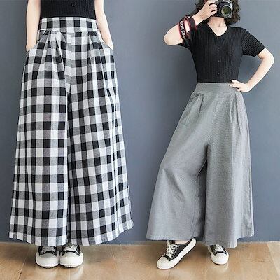 「ファットガール」 ワイドパンツ レディース ハイウエスト ドレープ 夏 綿麻 チェック トラウザーズ ストレートパンツ メガ割