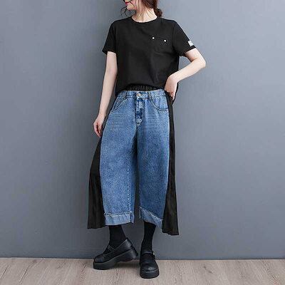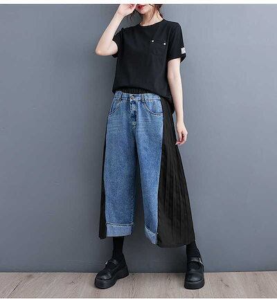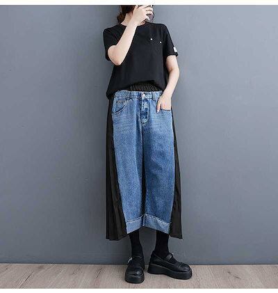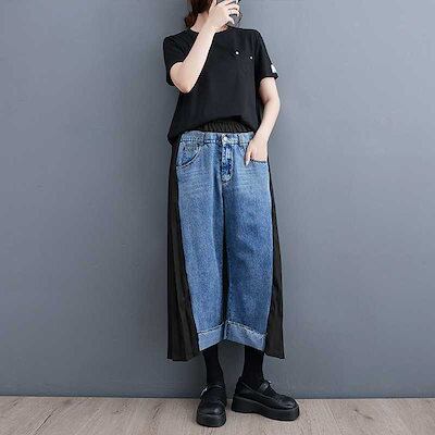「ファットガール」 秋 九分丈 デニムパンツ ドッキング レトロ プリーツ ワイドパンツ ハイウエスト スラックス レディース ロングパンツ メガ割