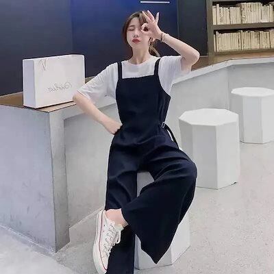 サロペット新しいオーバーオールワイドレッグパンツレディーススーツルーズブラックハイウエスト薄身 ストレートロングパンツ