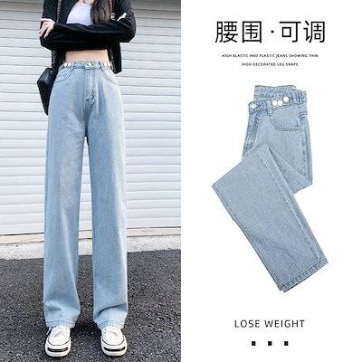 ジレンズ脚長効果 ジーパンレディース ストレートジーンズ ハイウエスト ゆとりがある ワイドパンツ ラッパズボン 調整可能 スキニージーンズ ジーパン
