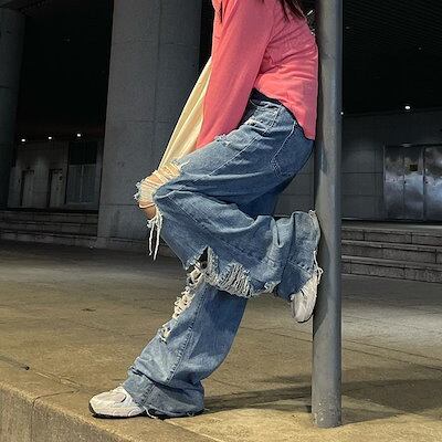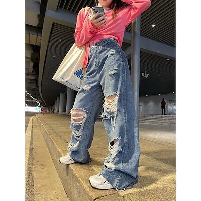 8月追加大人気レディー ハイウエスト ゆったり ストレートパンツ ワイドパンツ 大きいサイズ ダメージジーンズ