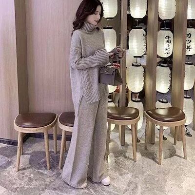 メガ割 感24レディースニットセット新作 タートルネックセーター+ワイドパンツニット二点セット怠惰な風オシャレ気質 上下レディースセット通勤長袖セーターロングパンツ二点セット