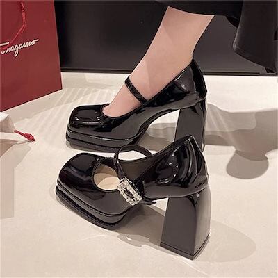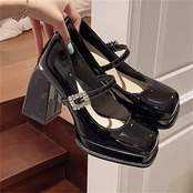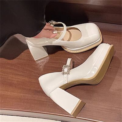 靴 シューズ パンプス 9cm 3色 チャンキーヒール ハイヒール スクエアトゥ ベルト キラキラ ビジュー 花飾り エナメル PU エレガント 可愛い 大人可愛い きれいめ シンプル カジュアル