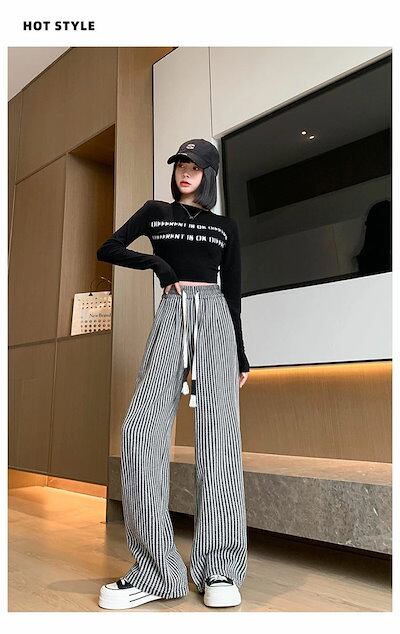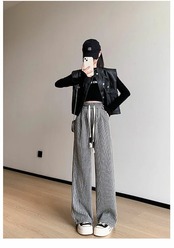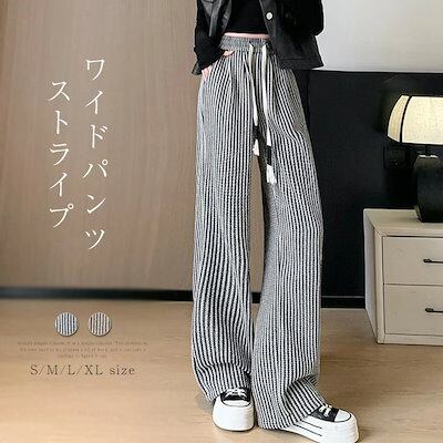 ワイドパンツ レディース ロングパンツ ストライプパンツ 春秋 ツイード風 ロング丈 ワイド パンツ ウエストゴム ストレート ズボン 大きいサイズ 体型カバー ゆったり カジュアル きれいめ 厚手