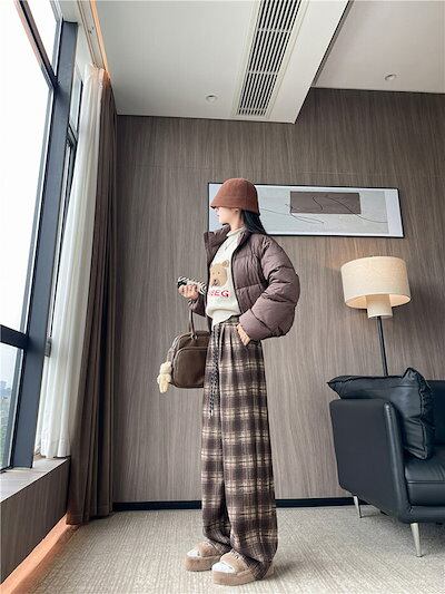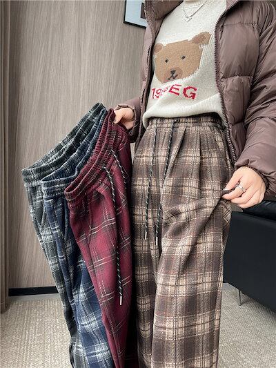 チェック柄ワイドパンツ レディース チェック パンツ 秋冬 裏起毛パンツ ロングパンツ ウエストゴム 大きいサイズ ゆったり リラックス 着心地よい 柔らか ファッション オシャレ 通勤 大人可愛い