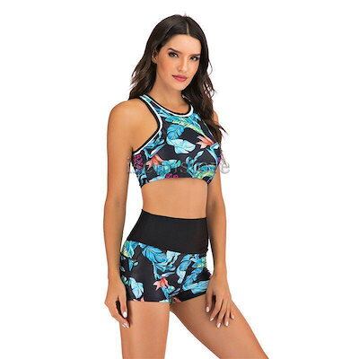 水着 体型カバー タンキニ レディース パット付き スポーツ水着 ジム フィットネス水着2点セット プール 海水浴 レジャー 花柄 セパレート