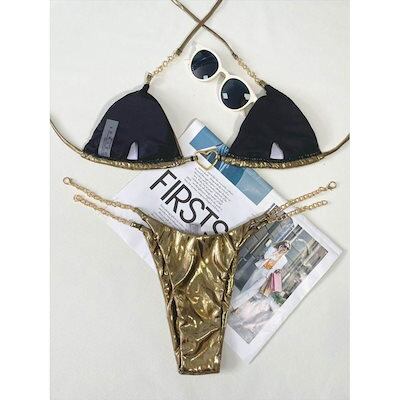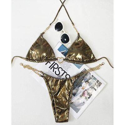 ブラジ ビキニ セク 水着 レディース メック 光沢 紐ビキニ 三角ビキニ 個性的 金色 銀色 ゴールド ー チェーン ハート柄 かっこ
